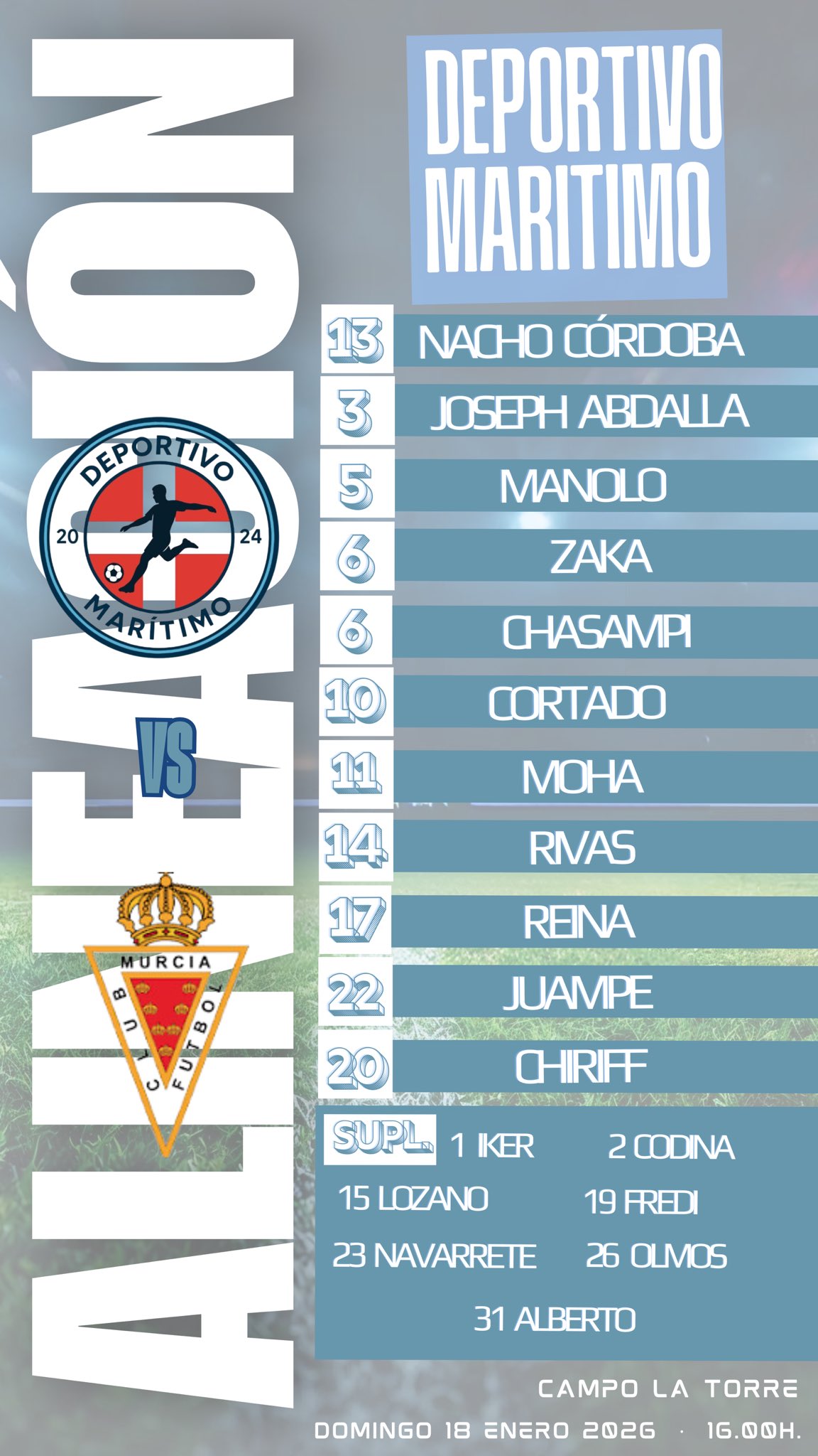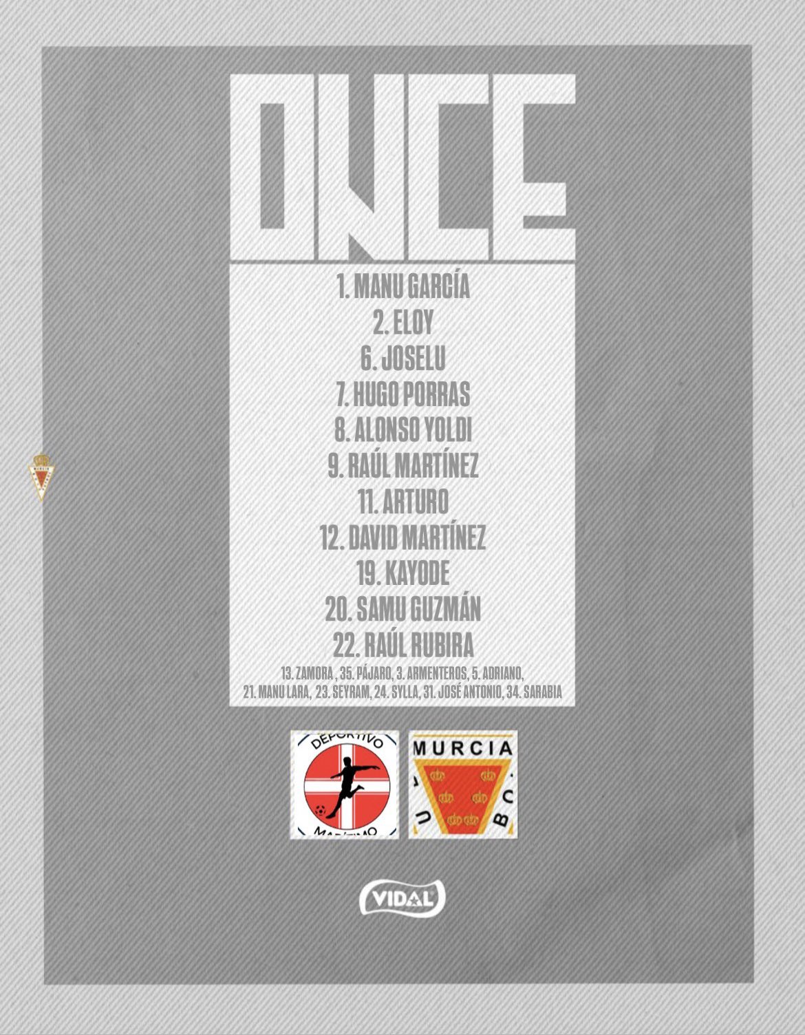 Alineación del Mazarrón: Lolo; Ardil (Imad 24'), Murillo, David Jiménez, Gastón, Taborda, Yanfree (Alberto Navarro 78'), Saúl (Guimimi 78'), Valdeolivas, Puche (Johan 78') y Pérez-Reverte (Jonis 89').