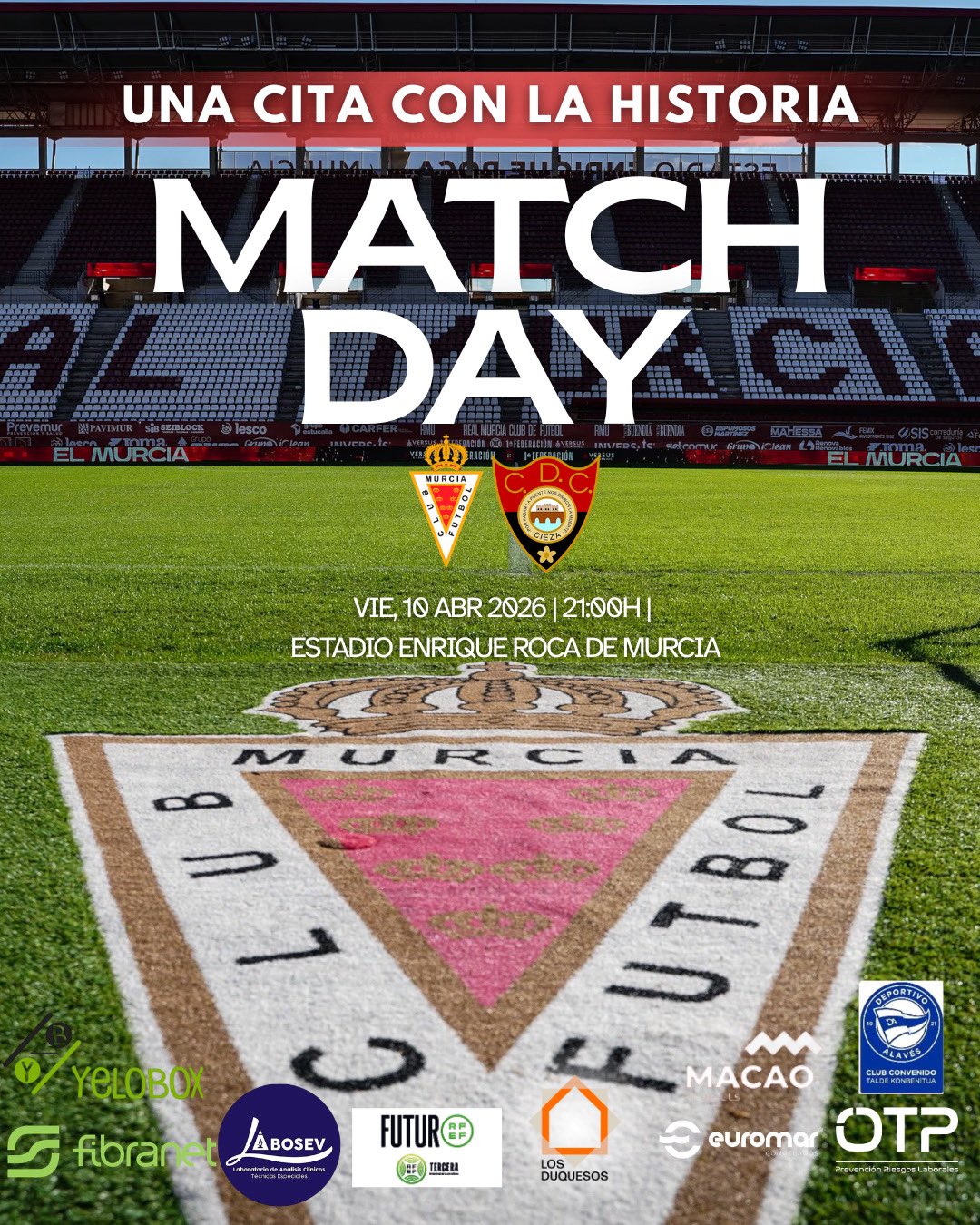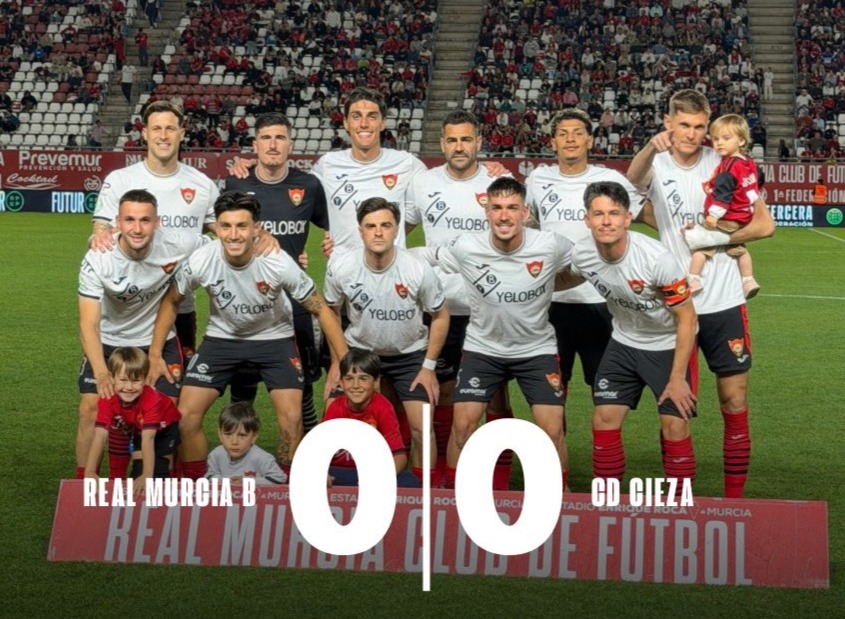 Incidencias: Partido disputado a las 21:00 horas del viernes 10 de abril de 2026 en el estadio Enrique Roca (Nueva Condomina). Choque correspondiente a la trigésima jornada de Liga del Grupo XIII de la Tercera RFEF. Unos 3.000 espectadores, la mayoría ciezanos, en una tarde calurosa para estas fechas. Los abonados pagaron 5 euros y la entrada general costó 10 euros.