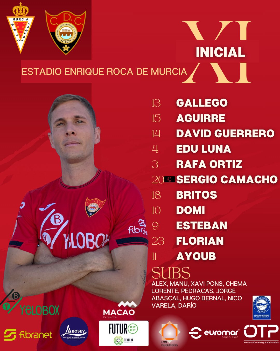 Alineación del Cieza: Gallego, Aguirre, David Guerrero, Edu Luna, Rafa Ortiz (Chema Lorente 80'), Sergio Camacho (Xavi Pons 80'), Britos, Domi, Esteban (Nico Varela 88'), Florian y Ayoub (Darío 61').