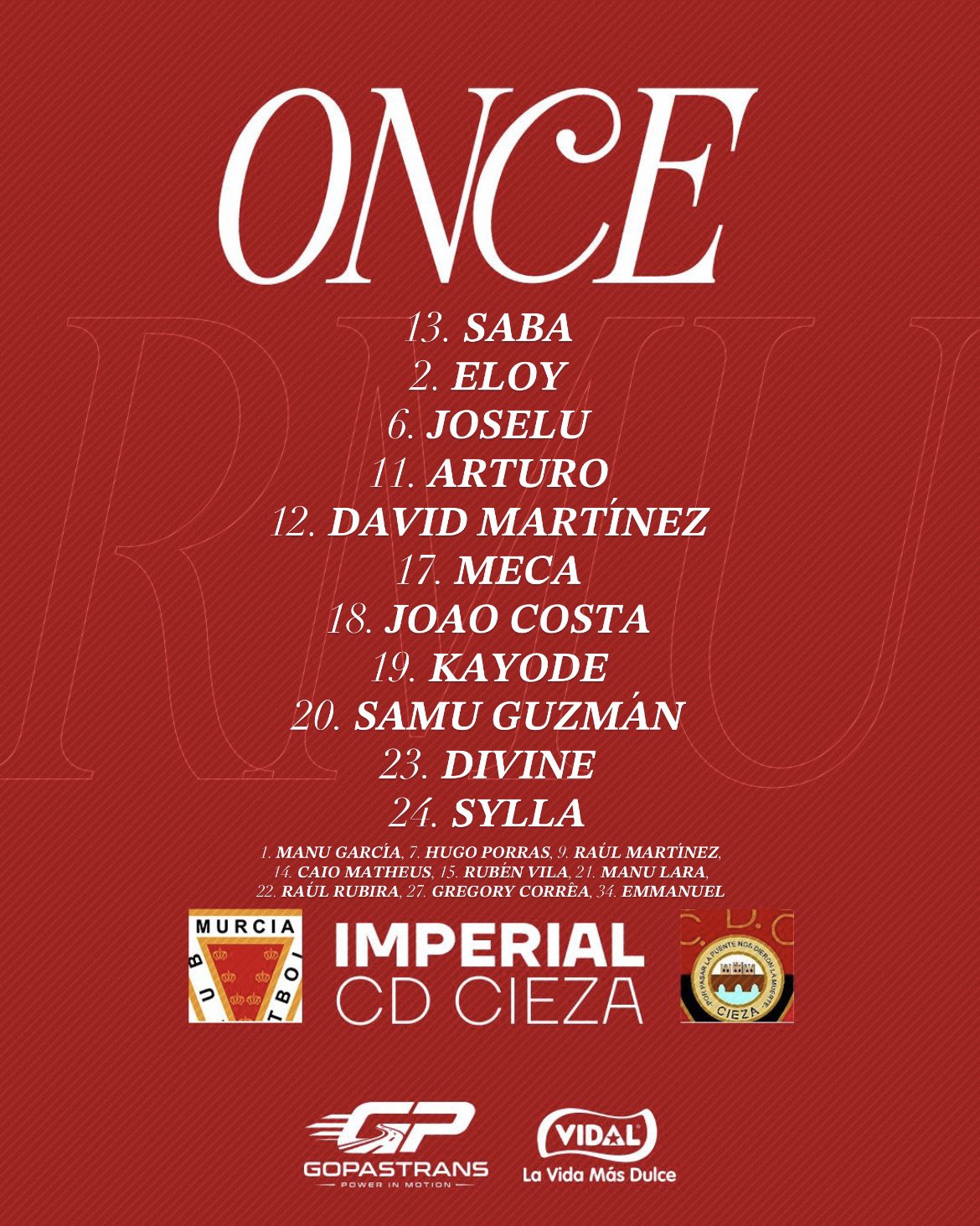 PD1: Se quedarron fuera de la convocatoria los convocados con el primer equipo: Jorge Sánchez y Yoldi. Están lesionados de larga duración y se pierden la temporada Carlos Zaragoza, Luizinho, Izan y Quetglas.