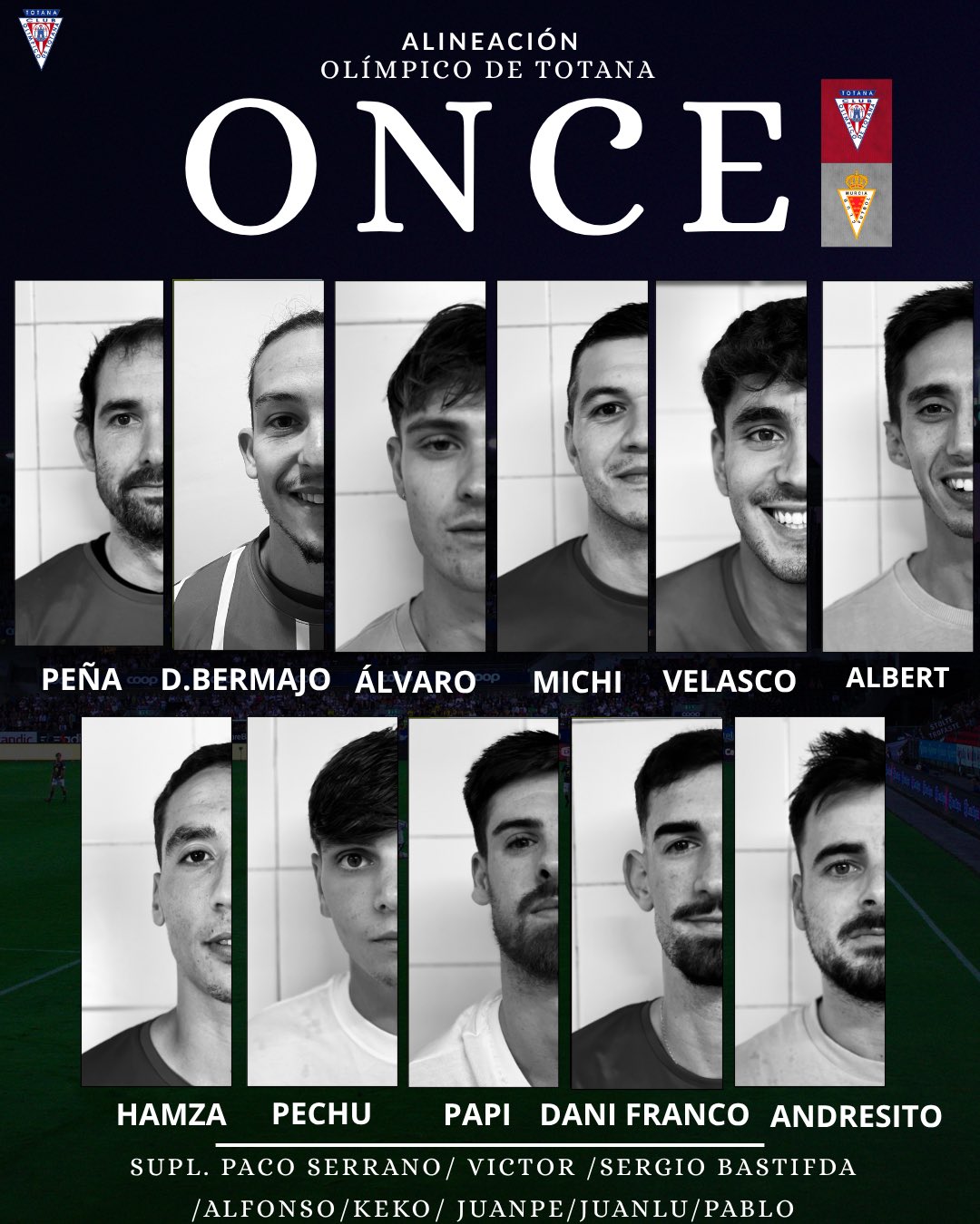 Alineación del Olímpico de Totana: Peña, Dani Bermejo (Sergio Bastida 84'), Álvaro, Michi, Velasco, Hamza (Keko 77'), Albert, Pechu, Papi (Víctor 84'), Dani Franco (Serrano 67') y Andresito (Juanpe 67').