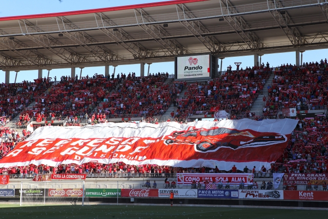 La afición del Real Murcia lució un gran tifo con el lema "Regreso a Segunda".